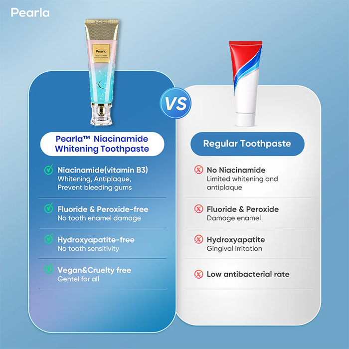 Pearla™ is powered by niacinamide, an ingredient more often found in premium skincare. It not only whitens teeth but also helps repair enamel and support gum health - things most toothpastes don’t target together.